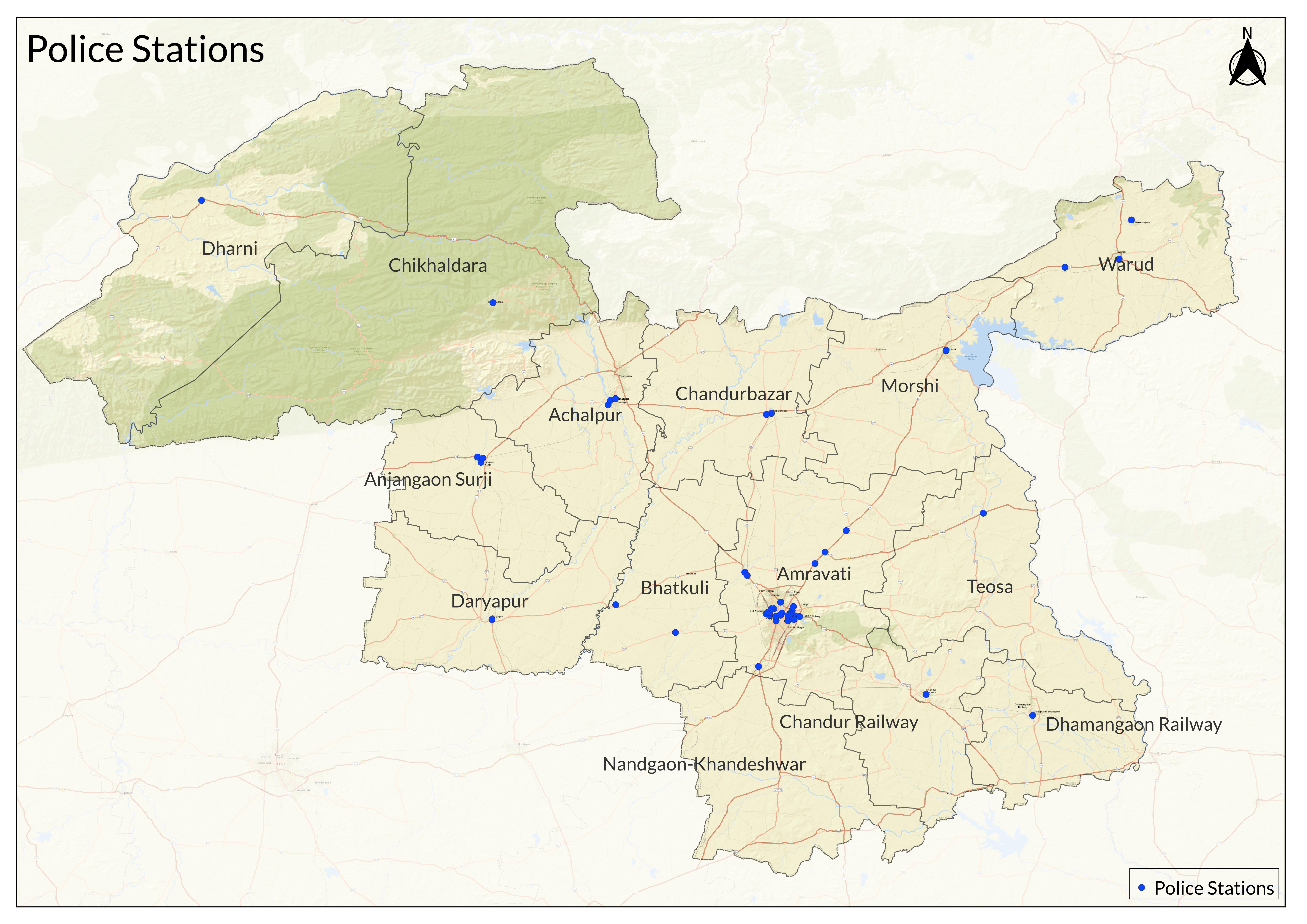 Amravati City Police oversee two talukas—Amravati and Bhatkuli—and operate ten police stations, covering urban centers and some rural areas like Nandgaon Peth, Bhatkuli, and Walgaon. The stations are grouped into three subdivisions: Frezarpura, Rajapeth, and Gadge Nagar, for better coordination.