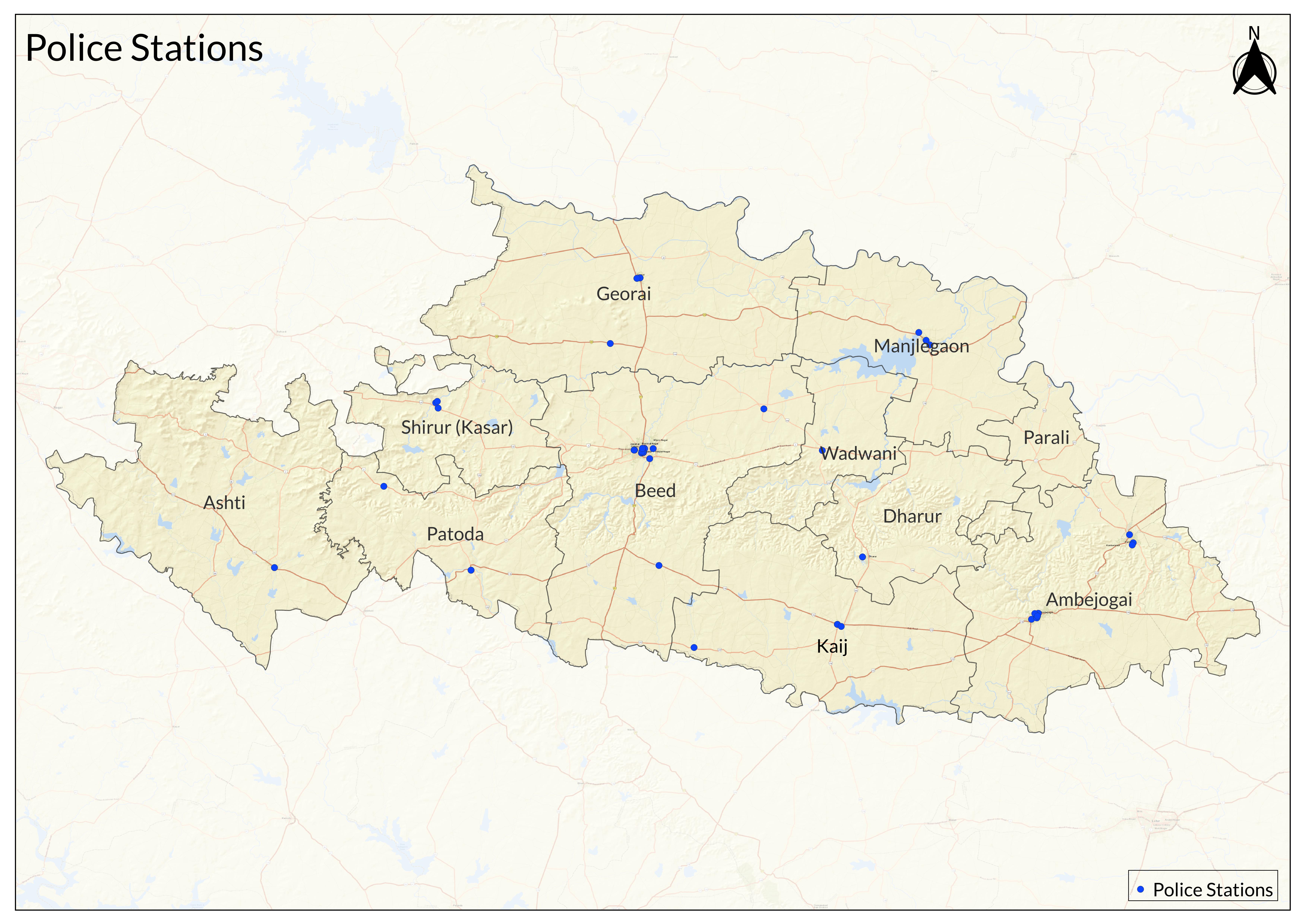 The Beed Police maintain a well-organized network of police stations across the district, ensuring law enforcement coverage in urban, rural, and industrial areas. The district is served by multiple police stations, including Beed City, Beed Gramin, Ambajogai City, Ambajogai Gramin, Kaij, Majalgaon, Parli City, Parli Gramin, Patoda, Peth Beed, Shirur, and Wadwani.
