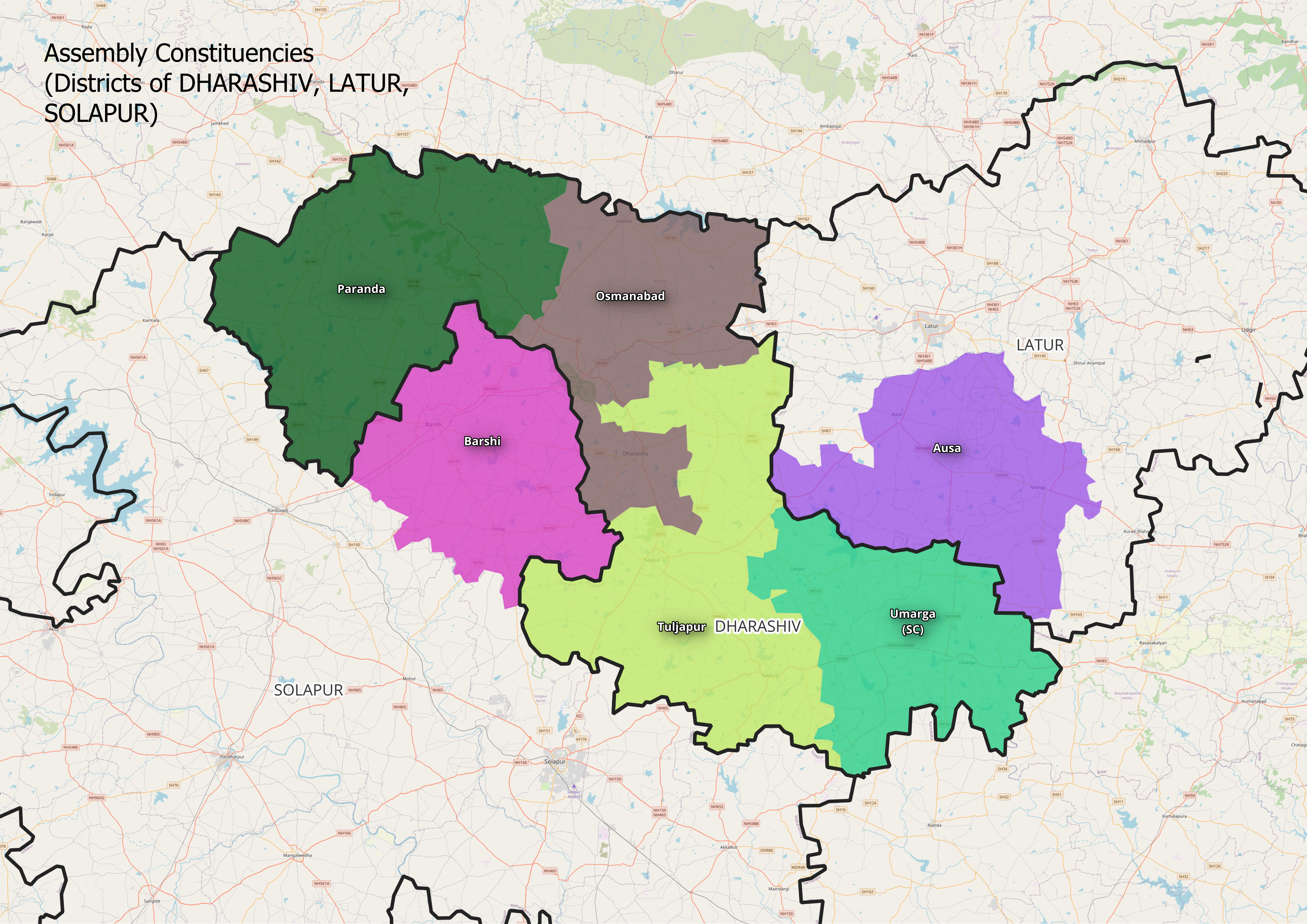 The given maps provide an overview of the boundaries of the Dharashiv district and the Vidhan Sabha and Lok Sabha constituencies that fall within and around it.
