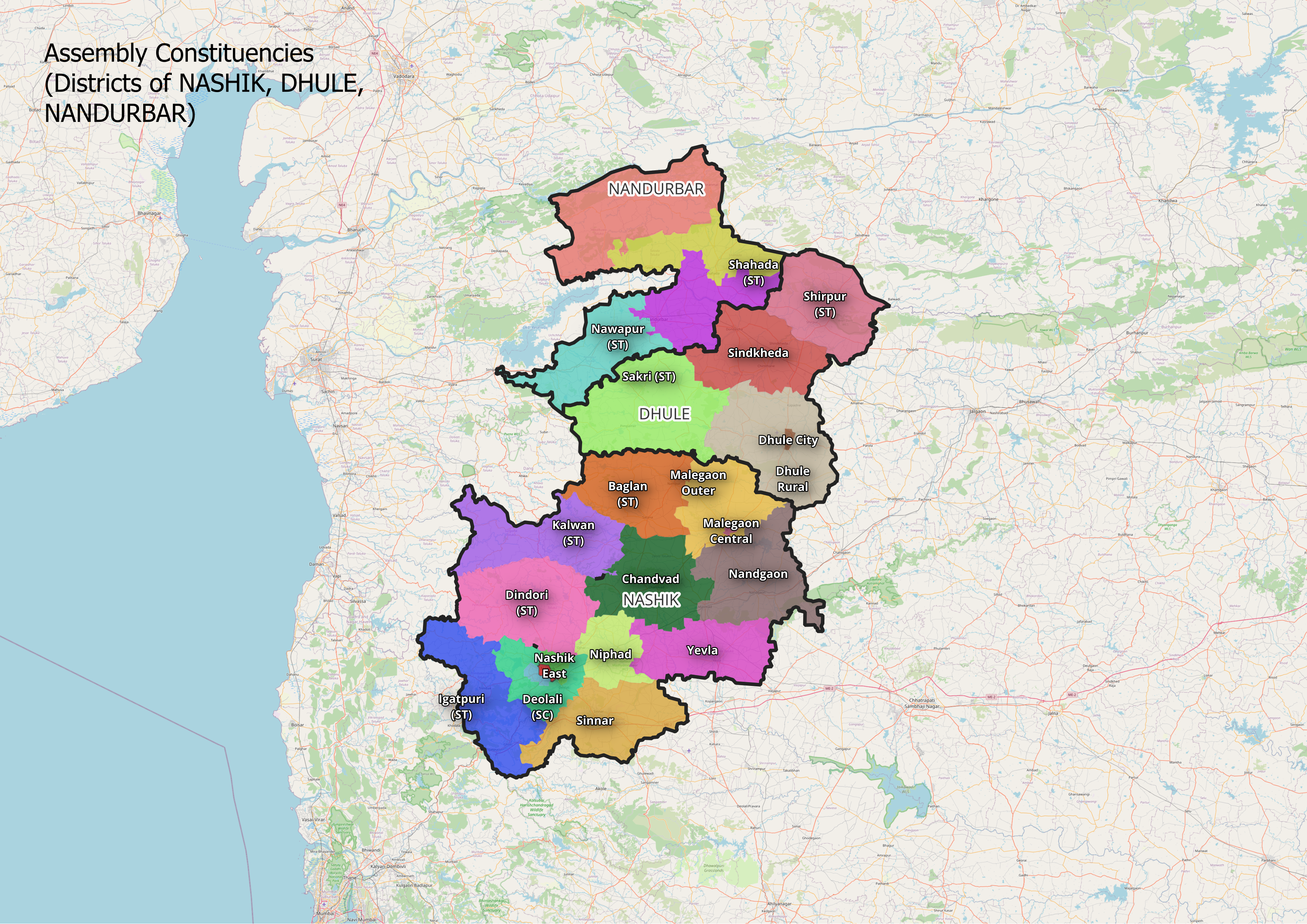 The Nashik district consists of the Lok Sabha constituencies: Nashik and Dindori, and the following Vidhan Sabha constituencies: