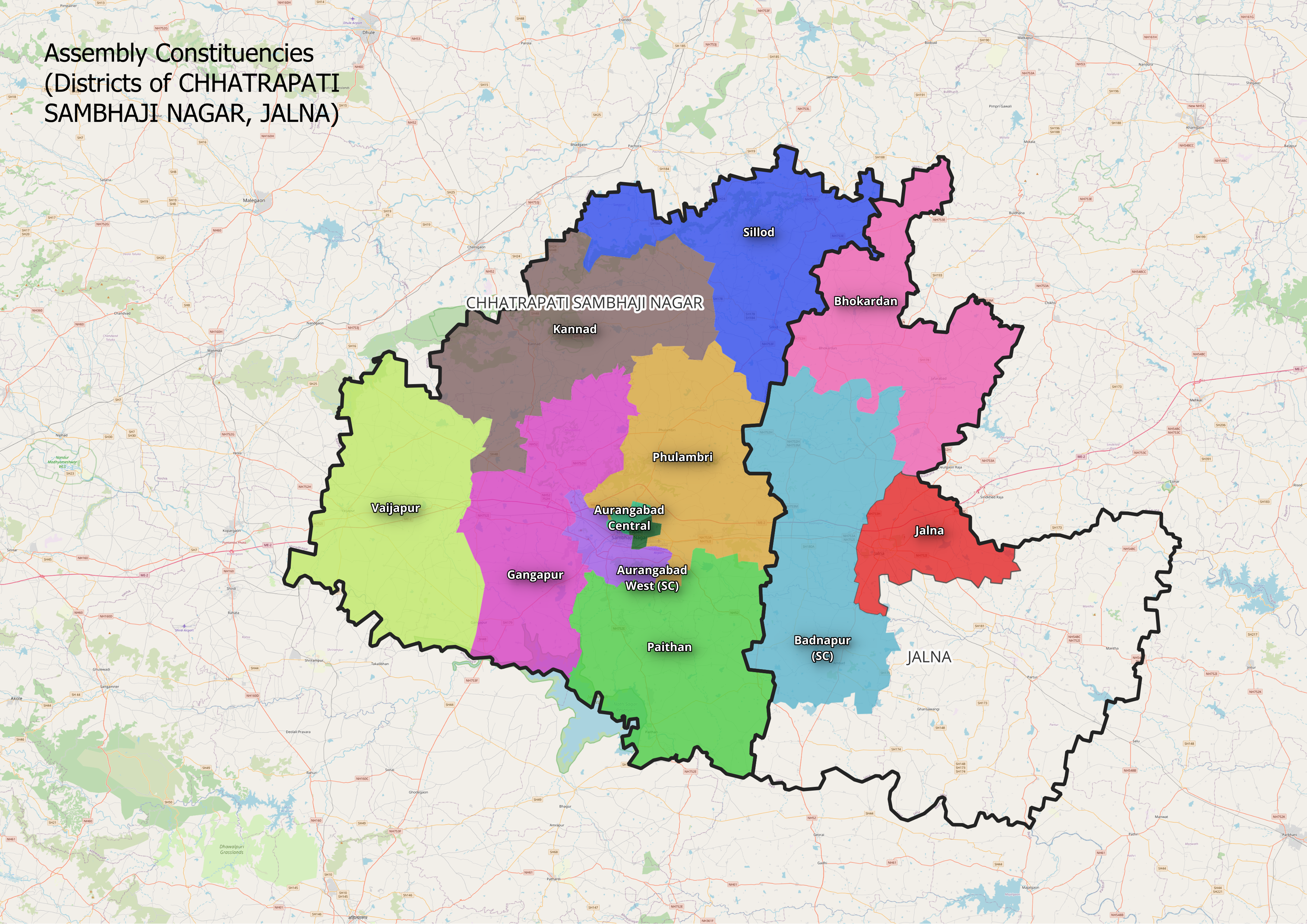 The Chhatrapati Sambhaji Nagar district consists of the Aurangabad Lok Sabha constituency, which includes the Vidhan Sabha segments: Kannad, Aurangabad Central, Aurangabad West, Aurangabad East, Vaijapur, and Gangapur. Along with these constituencies, some Vidhan Sabha segments of Jalna Lok Sabha fall in the district: Sillod, Phulambri, and Paithan.