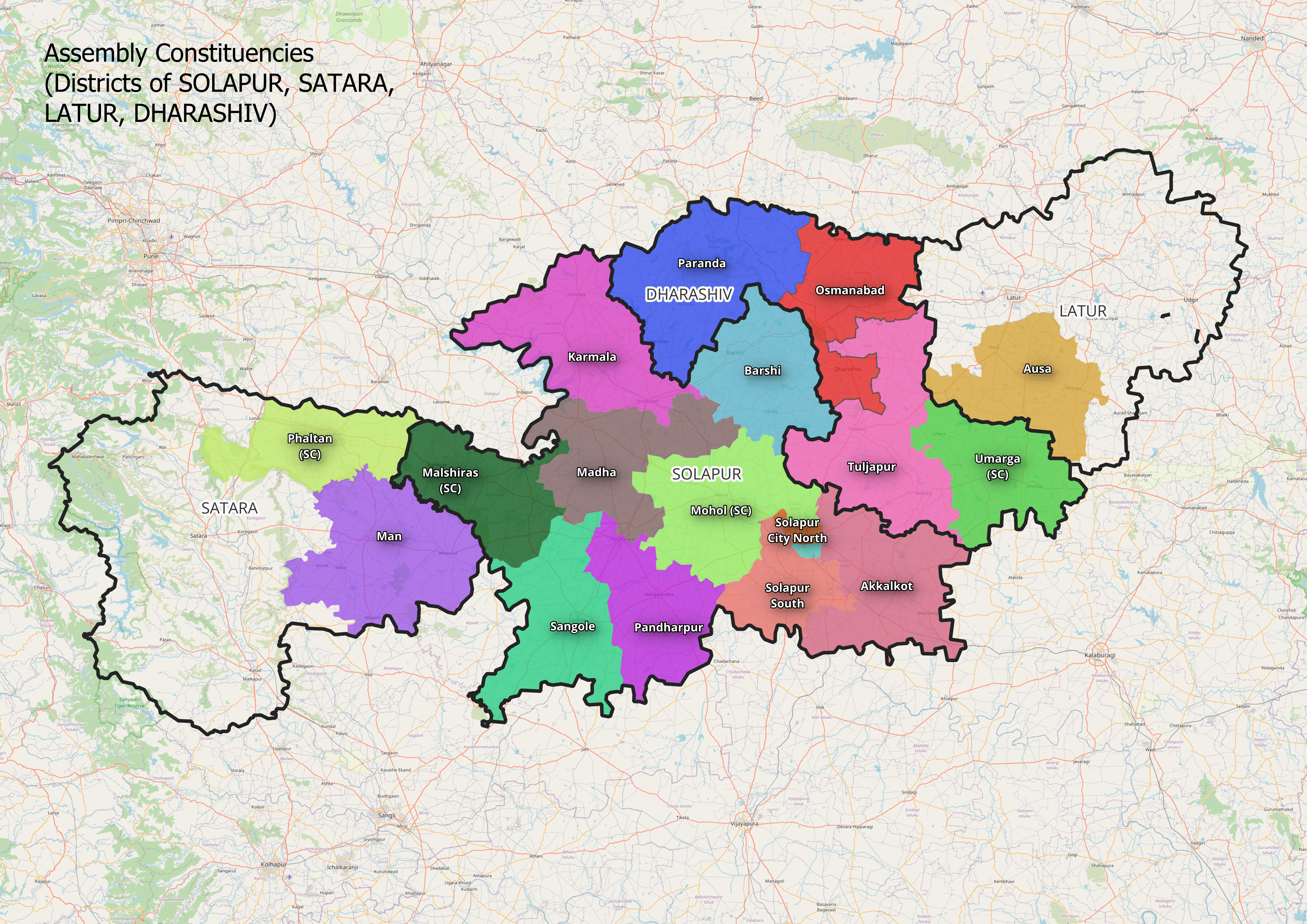 The given maps provide an overview of the boundaries of the Solapur district and the Vidhan Sabha and Lok Sabha Constituencies that fall within and around it.